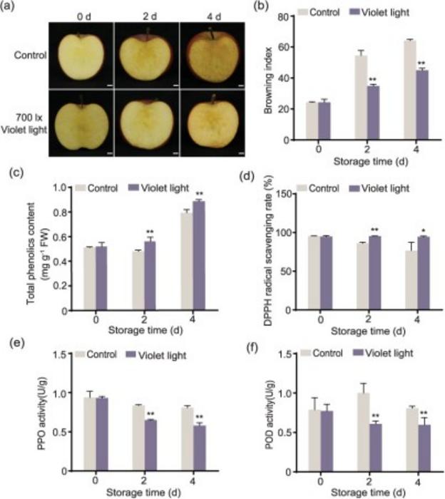 Violet LED light increased the antioxidant capacity and decreased oxidative enzyme activities of fresh-cut apple fruit. (a) ‘Fuji’ apple fruit were harvested in 2020 at 180 DAFB. Apple slices were treated with violet LED light at 700 lx at 10°C for 4 days, and samples were collected every 2 days. The samples were stored in the dark at 10°C as a control. Bars: 1 cm. BI (b), total phenolics content (c), DPPH radical scavenging rate (d), PPO activity (e), and POD activity (f) were investigated in the control and violet LED light-treated samples. The samples placed in the dark were used as a control. Data represents the means ± SE. Asterisks indicate significant differences (*P < 0.05; **P < 0.01, Student’s t-test).
