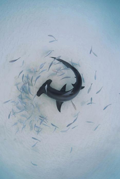 A great hammerhead shark circles beneath the water, surrounded by smaller fish. Image by Annie Guttridge.