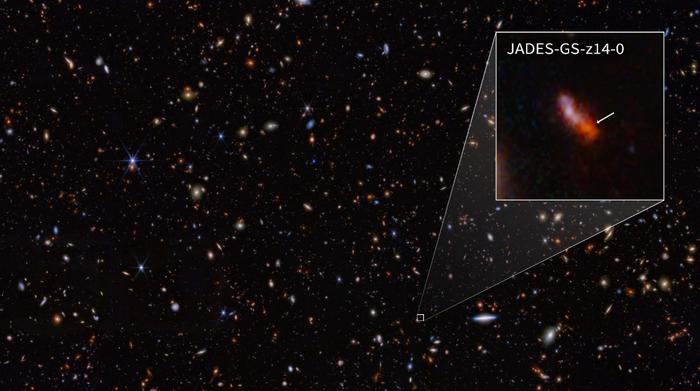 This infrared image from NASA’s James Webb Space Telescope was taken by the onboard Near-Infrared Camera for the JWST Advanced Deep Extragalactic Survey, or JADES, program. The NIRCam data was used to determine which galaxies to study further with spectroscopic observations. One such galaxy, JADES-GS-z14-0 (shown in the pullout), was determined to be at a redshift of 14.3, making it the current record-holder for most distant known galaxy. This corresponds to a time less than 300 million years after the big bang.