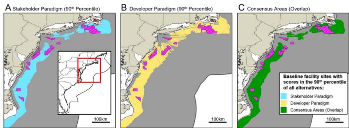 Ideal locations and scales for offshore wind installations depend on both physical conditions and social acceptability. Rudolph Santarromana and colleagues conducted a spatial multi-criteria analysis considering both techno-economics and a socio-environmental impacts, including a broad range of possible concerns, including visual, fishing, marine life, and vessel traffic impacts. Fifty-eight percent of plant location alternatives are suitable from the perspective of developers (techno-economic perspective), but just eighteen percent of sites are suitable from the perspective of a broad range of external stakeholders (socio-environmental perspective). Nearly all the past and current offshore wind project proposals are in suitable areas for developers, but many—including the cancelled Cape Wind project in Nantucket Sound off the coast of Massachusetts—are in unsuitable areas for stakeholders, according to the analysis. The authors mapped areas that both developers and external stakeholders would likely consider suitable, which on the East Coast has the potential for 600 GW of power. On the West Coast, consensus areas are scarce, with only potential for 5 GW of power owing to greater depths nearshore that limits the possible development area. Using unmoored floating turbines and power-to-hydrogen—which does not require transmission cables—might increase the consensus areas on the West Coast, albeit at greater investment costs. Investment tax credits currently in place may help develop plants that are more socio-environmentally suitable. Finally, the authors find that while the industry is moving toward larger projects, smaller projects afford less uncertainty in their impacts, and are potentially more robust and flexible for development in various sites. According to the authors, developers should focus on consensus areas and consider smaller projects when proposing offshore wind installations.