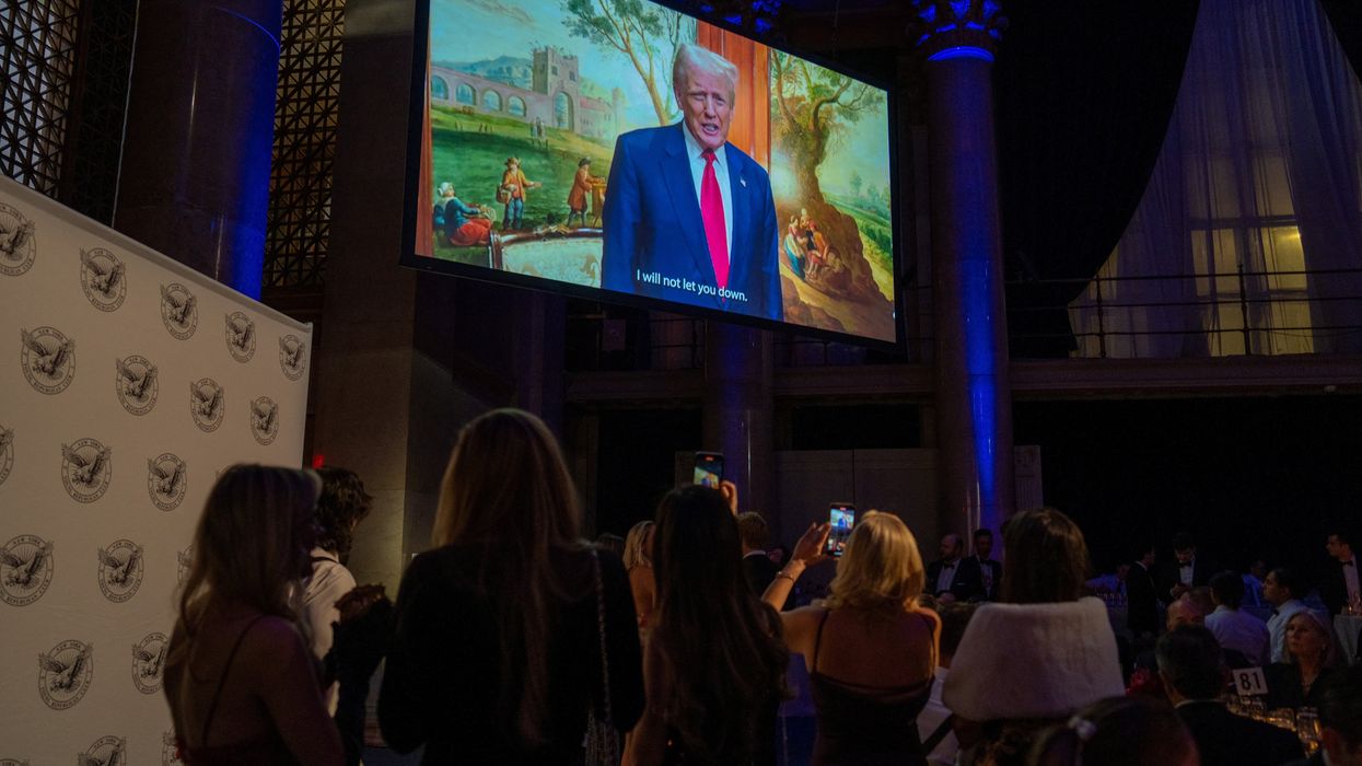 Donald Trump speaks on screen in a prerecorded message to the attendees of the New York Young Republican Club's Annual Gala at Cipriani Wall Street in New York City, U.S., December 15, 2024. REUTERS/David 'Dee' Delgado