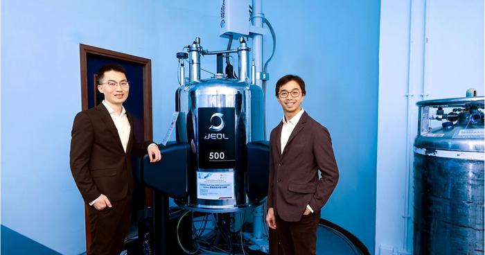 A PolyU research team from the Department of Applied Biology and Chemical Technology has successfully mapped the precise locations of individual and paired aluminium atoms in the zeolite framework. Pictured are Prof. Benedict Lo, Associate Professor (right); and Dr Guangchao Li, Research Assistant Professor (left), alongside the only SSNMR facility in Hong Kong, which is installed at PolyU.