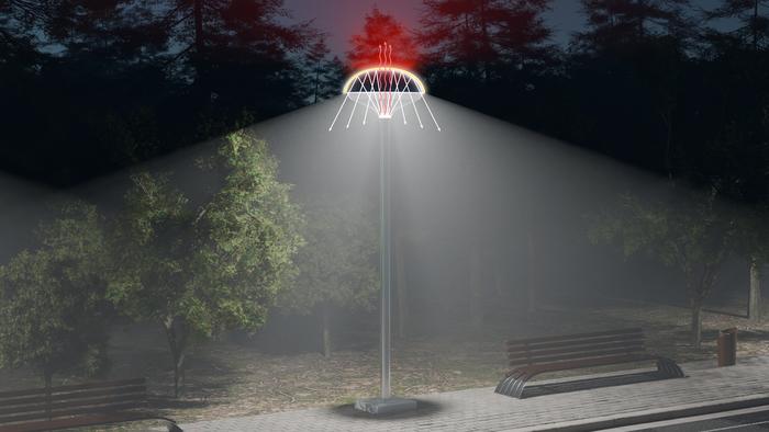 Typical LED streetlights direct their light toward the object to be illuminated, which is why they point towards the ground. They also are designed such that thermal radiation stays trapped inside the LED. On the other hand, streetlights coated with nanoPE are literally turned upside down so that they are directed towards the sky and away from the object to be illuminated.
