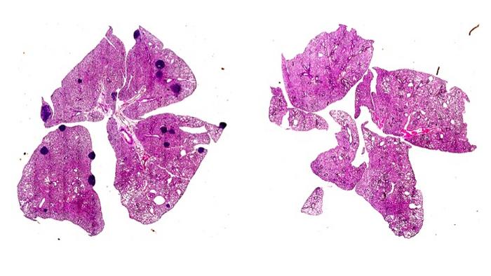 Mice with breast tumours developed metastatic cancer in their lungs (visible as dark deposits), whereas this was prevented in mice lacking ARHGEF1 - a key protein involved in suppression of T cell immunity by the clotting factor Thromboxane A2.