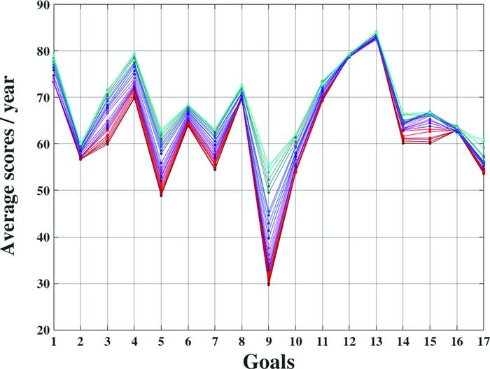 Parallel plot of the 17 SDG. Comparison among all the yearly average SDG scores, from 2000 to 2022. Scale color goes from dark red (2000) to light blue (2022).