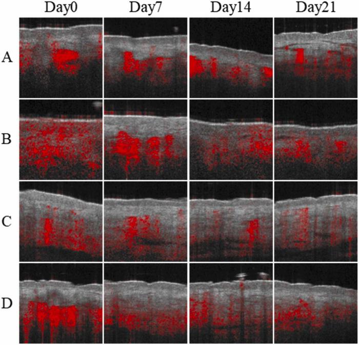 Fig. Effect of VivoSight OCT observation on blood vessel density of subjects.The marked test areas for subjects A-D were the left facial skin, left nasal skin, the back of the left hand, and the left elbow skin. The number of biological replicates is 4, the number of experimental replicates is 3.