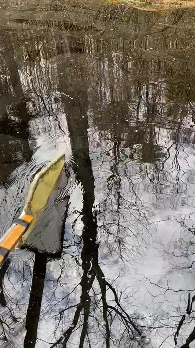 Catching tadpoles of the wood frog with a net