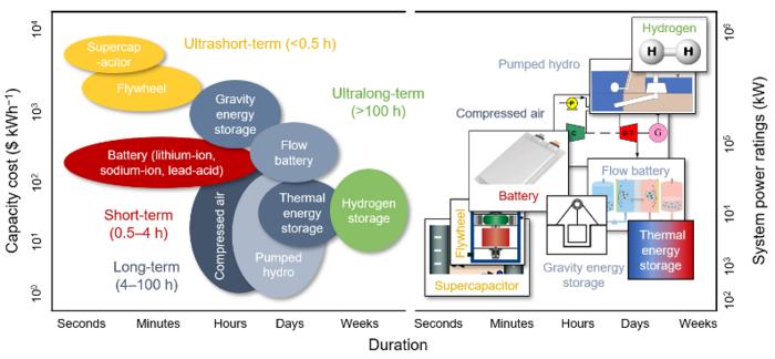 Duration, capacity cost, and system power ratings are listed for various energy storage technologies. The yellow, red, grey, and green oval shades on the left of the figure represent ultrashort-term, short-term, long-term, and ultralong-term energy storage technologies, respectively.