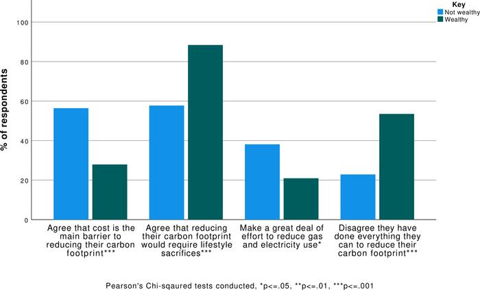 Wealthy participants reported high consumption-based emissions relating to food, energy, shopping and transportation (e.g., flying frequently) but expressed low motivation to reduce consumption, preferring luxury, and the ability to keep up with social norms. However, the researchers identified three positive climate capabilities for this demographic: the means to invest in or purchase costly green technologies (e.g., electric vehicles); knowledge and a sense of urgency (if not culpability) about climate change and climate policy; and social and professional influence.