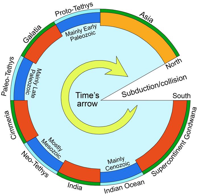 The conceptual sketch of multiple Wilson cycles for a series of subduction‐collision‐subduction processes during the evolution of Tethyan realm during the Phanerozoic, with the final collision between the Indian and Asian continents in the Early Cenozoic.