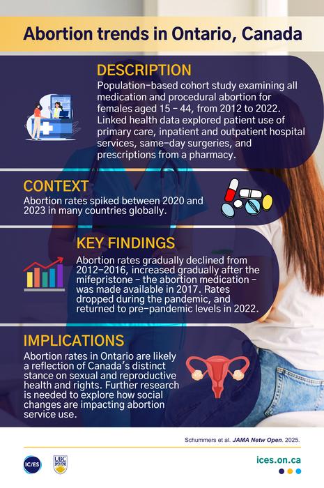 Researchers from the University of British Columbia and ICES found that, after accounting for changes in the abortion rate when the abortion medication mifepristone was introduced in 2017 and during the COVID-19 pandemic, abortion rates held fairly steady in Ontario through 2022.