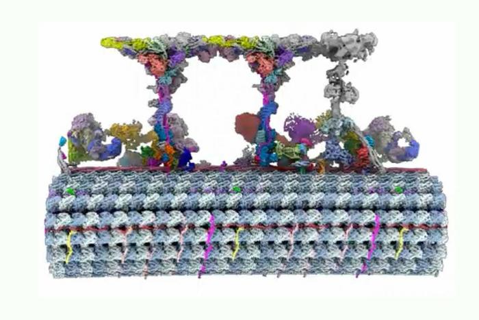 This image shows a three-dimensional map of the basic structural unit in the parasite Trypanosoma brucei’s flagellum, with various mechanical and motor proteins labeled.