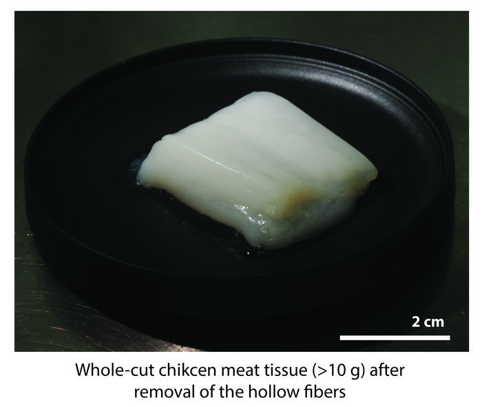 The authors demonstrated the biofabrication of centimeter-scale chicken skeletal muscle tissues using a Hollow Fiber Bioreactor (HFB) consisting of an array of 50 hollow fibers. In addition, they implemented a robot-assisted assembly system for the fabrication of a 1,125-fiber HFB and produced whole-cut chicken meat weighing more than 10 g using chicken fibroblast cells, which make up connective tissue.