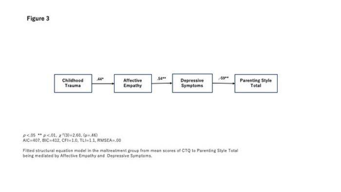 In this study by researchers from the University of Fukui, the model used by them shows that childhood trauma affects parenting style, but this effect is mediated by affective empathy and depressive symptoms.