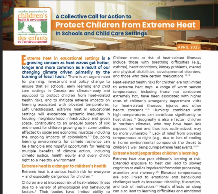 Amid Government of Canada warnings of near record heat ahead in 2025, the Canadian Partnership for Children’s Health and Environment (CPCHE) and the Canadian Environmental Law Association (CELA) say Canada’s schools and child care facilities are ill-prepared and children are paying the price.