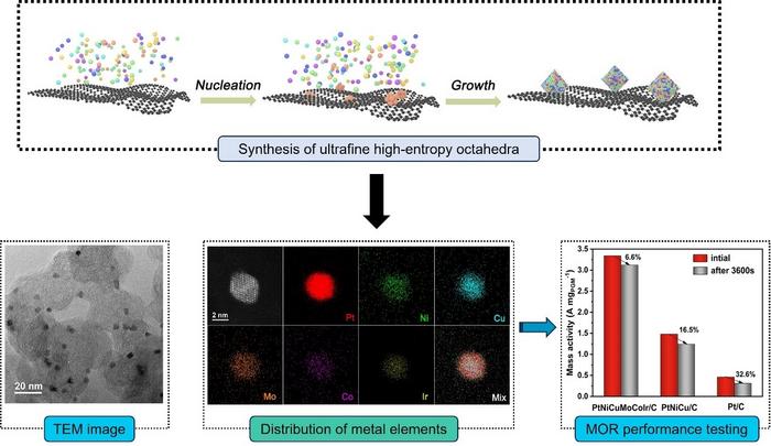 In response to this challenge, a research team led by Prof. ZHANG Tierui from the Technical Institute of Physics and Chemistry of the Chinese Academy of Sciences (CAS) has developed a new catalyst that significantly enhances the efficiency and durability of methanol oxidation reactions. Composed of ultrafine platinum-based high-entropy alloy (HEA) octahedra, the catalyst marks a promising advance in DMFC efficiency and resistance to catalytic poisoning.