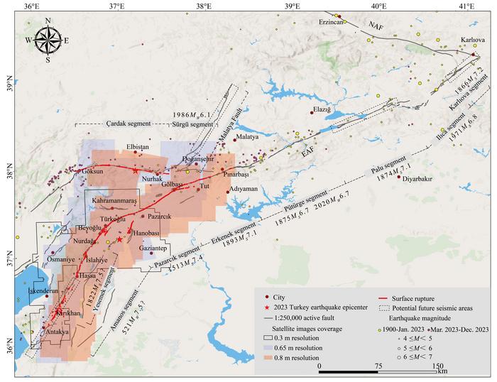 This study is led by Prof. Yue-Ren Xu at the Institute of Earthquake Forecasting, China Earthquake Administration (IEF, CEA). This article focuses on using high-resolution satellite data to rapidly assess surface ruptures caused by strong international earthquakes. Post-earthquake high-resolution satellite images have become invaluable in mapping coseismic surface ruptures induced by strong earthquakes. This study took the 2023 Türkiye earthquake doublet as an example. On February 6, 2023, twin earthquakes shook southeastern Türkiye and northwestern Syria. The first earthquake, known as the Pazarcık earthquake, occurred at 1:17 A.M. GMT (4:17 AM local time) with a moment magnitude of MW7.8 and a focal depth of 10 km. The second strong earthquake, the Elbistan earthquake, occurred 9 hours later, with MW7.5 (37.196°E, 38.011°N) and a focal depth of 7.4 km.