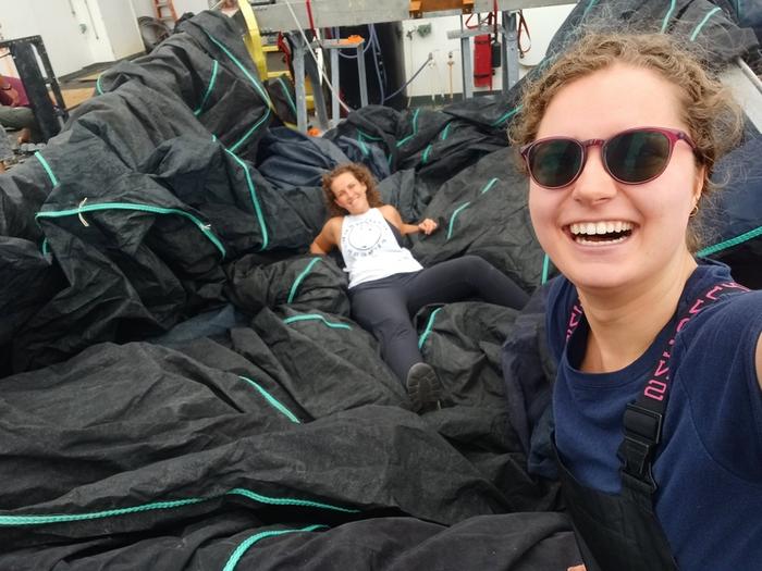 Ciara Willis, foreground, and co-author Kayla Gardner pose with MOCNESS, a series of big nets that are used to target different ocean depths, on an August 2022 research expedition.