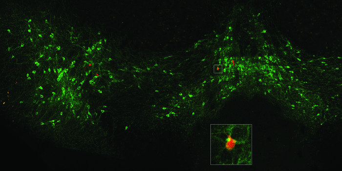 An edited version of a figure from the research shows the ventral tegmental area, highlighting dopamine-associated neurons in green and one that connects to the posterior amygdala (magnified in inset) in red