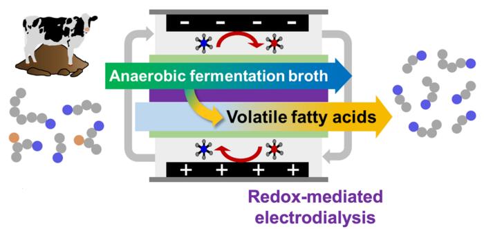 Volatile fatty acid separation from biowaste. Cattle manure is anaerobically digested in a bioreactor, and the resulting broth is processed with redox-mediated electrodialysis. The volatile fatty acids pass through the selective filters.