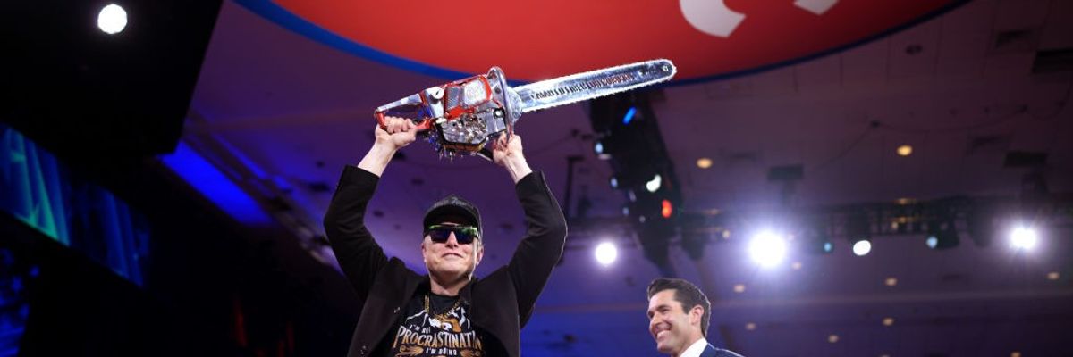 CEO of Tesla and SpaceX Elon Musk wields a chainsaw as he leaves the stage alongside Newsmax anchor Rob Schmitt at the Conservative Political Action Conference (CPAC) at the Gaylord National Resort Hotel And Convention Center on February 20, 2025 in Oxon Hill, Maryland.