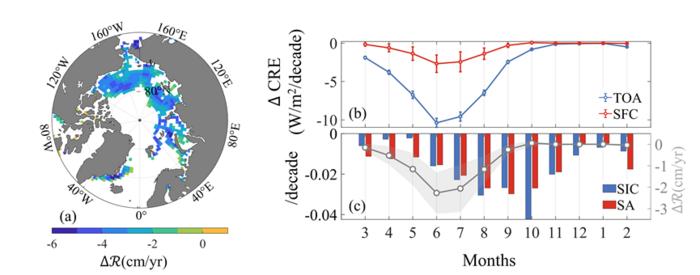 (a) geographical distribution of the annual average of ∆R ; (b) the monthly variations of ∆CRE at the TOA and the SFC, with the error bars representing the standard deviation; (c) the monthly average trends of SIC and SA (histogram) and the variation of ∆R (gray line), with the shadow representing the standard deviation of ∆R .