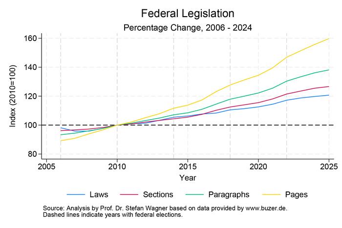 In 2010, the body of federal law comprised 1,082 individual statutes totaling approximately 24,775 pages. By early 2025, that number had grown to 1,306 statutes and about 39,536 pages of legislation. This represents an increase in legislative volume of around 60 percent over 15 years. When compared to the previous year, the index has risen by another 2.5 percent, despite ongoing political pledges to reduce bureaucracy. Regulation in Germany is not decreasing; instead, it continues to grow.