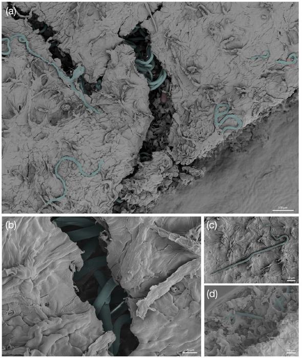 A scanning electron microscope reveals nematodes (highlighted in green) inside the spongy mesophyll of a European beech (Fagus sylvatica) leaf infected with beech leaf disease (BLD). Eggs are marked in red for enhanced visualization. Natural fractures in the leaf surface suggest pathways for nematode migration from within the leaf to its outer surface. New research confirms that European beech is susceptible to BLD, raising concerns about global forest health.