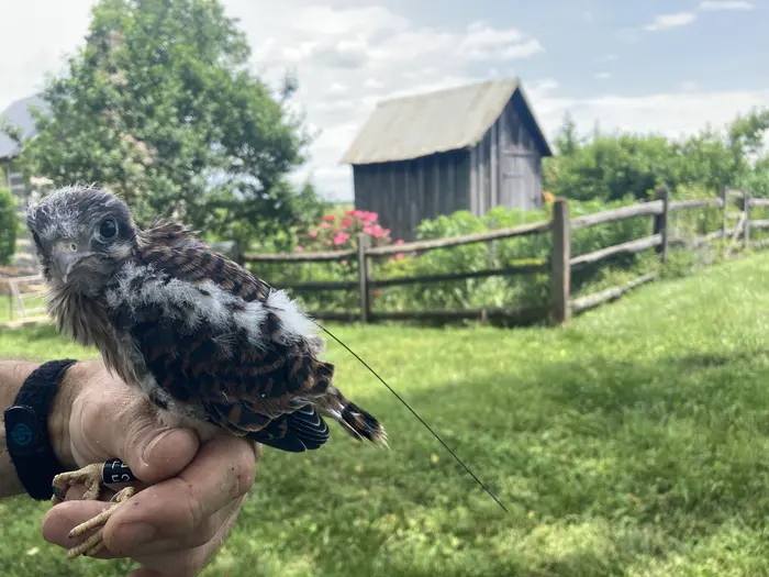 A female American Kestrel nestling with its recently attached VHF back-pack style transmitter in the Virginia Piedmont study area. Feathers cover all but the antenna.