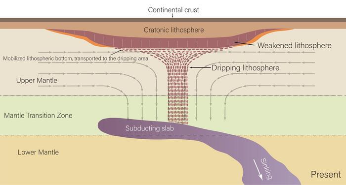 A figure from the study showing rock dripping from the craton. The researchers hypothesize that the dripping is caused by the remnants of the subducting Farallon slab below the craton.