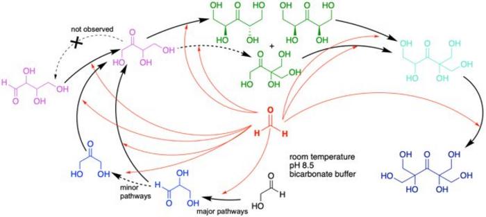 The formose reaction was serendipitously discovered in 1861 and has been a leading hypothesis for prebiotic sugar formation ever since. During the reaction, formaldehyde molecules spontaneously and repeatedly react with each other to create larger molecules: first two formaldehydes react to create a two-carbon molecule, which then reacts with another formaldehyde to create a three-carbon molecule, and so on and so on, until all the formaldehyde has been used up.