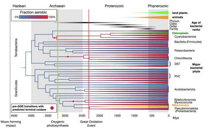 Bacterial evolution and oxygen adaptation: A timeline built from genomic, fossil, and chemical data. Colors show oxygen states: anaerobic (blue), aerobic (red), and proportion of aerobic lineages in modern bacterial phyla (purple shades). Analysis includes mitochondria and plastids to leverage eukaryotic fossil data. Land plants and animals are shown for time reference.