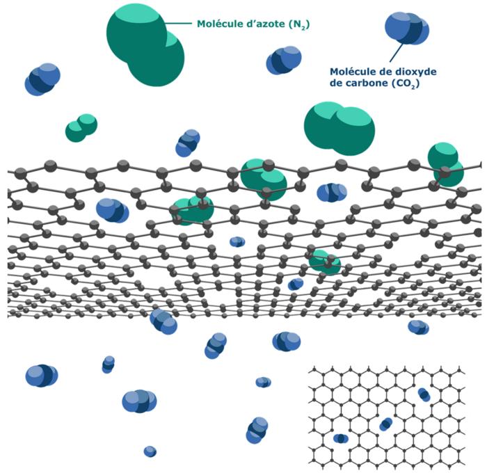 A cartoon of graphene membrane separating CO2 from N2.