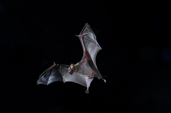 The Greater mouse-tailed bat flies through the night sky, searching for insects