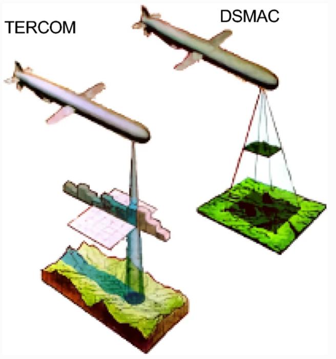 The image illustrates two different localization techniques for UAV navigation in GPS-denied environments: TERCOM (Terrain Contour Matching) on the left, which uses pre-mapped terrain data for absolute localization, and DSMAC (Digital Scene Matching Area Correlation) on the right, which compares real-time terrain data to a stored database. While TERCOM is effective in areas with distinguishable features, DSMAC provides more flexibility, particularly in dynamic and featureless environments.