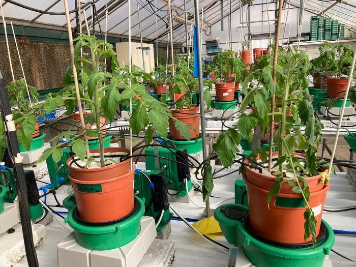 Tomato plants growing in a semi-controlled greenhouse on a high-throughput lysimeter-based physiological phenotyping platform. This system allows continuous measurement of plant water use.
