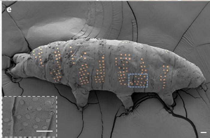 This tardigrade is sporting a new “tattoo” — represented in this magnified image by the highlighted dots, and visible in the inset image.