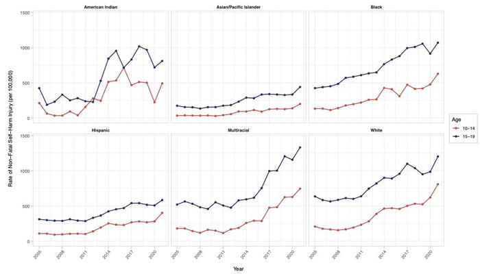 While documented self-harm rates have increased across the board, researchers found multiracial girls, in particular, have seen incidences surge since 2016.