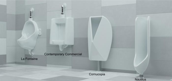 Three-dimensional renderings of urinals. From left to right: Duchamp’s “La Fontaine,” a contemporary commercial model, Cornucopia, and Nautilus.