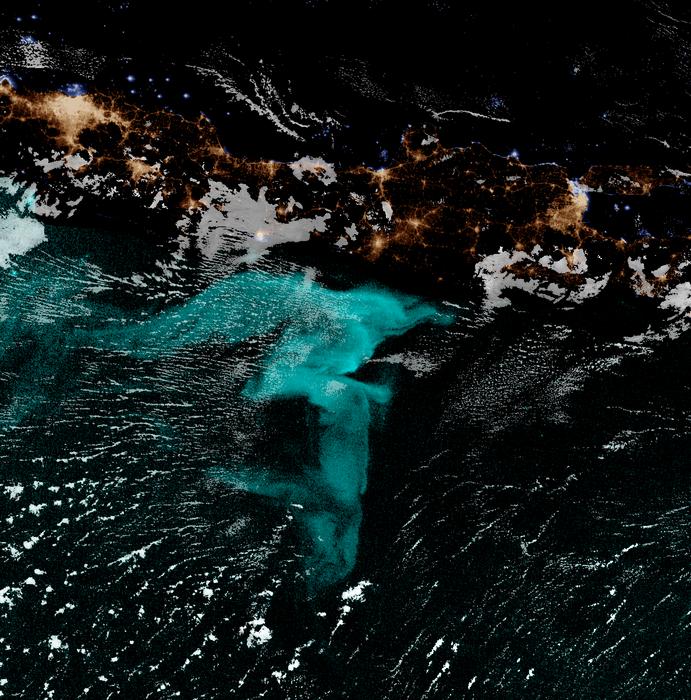 For centuries, sailors have told tales of milky seas – huge swaths of ocean glowing on dark nights, seen in blue in this false–color satellite image. Steven D. Miller/NOAA