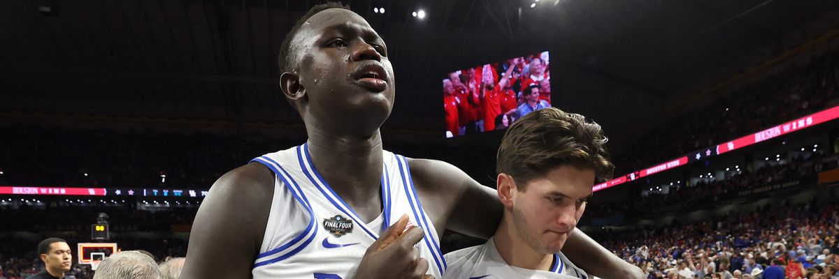 Khaman Maluach, who was born in the South Sudanese city of Rumbek and now plays for the Duke Blue Devils, reacts with teammate after the second half in the Final Four game of the NCAA Men's Basketball Tournament against the Houston Cougars at the Alamodome on April 5, 2025 in San Antonio, Texas.