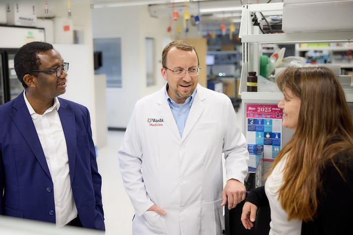 Philip Budge, MD, PhD (center), an associate professor in the Division of Infectious Diseases at WashU Medicine, speaks with collaborators Benjamin Koudou of the Centre Suisse de Recherches Scientifiques (CSRS) in Côte d'Ivoire (left) and Catherine Bjerum, MD, of Case Western Reserve University. Their recent clinical trial finds the anti-parasitic drug moxidectin – currently approved to treat river blindness, another tropical disease caused by parasitic worms – is also more effective for lymphatic filariasis than the current gold standard, ivermectin.