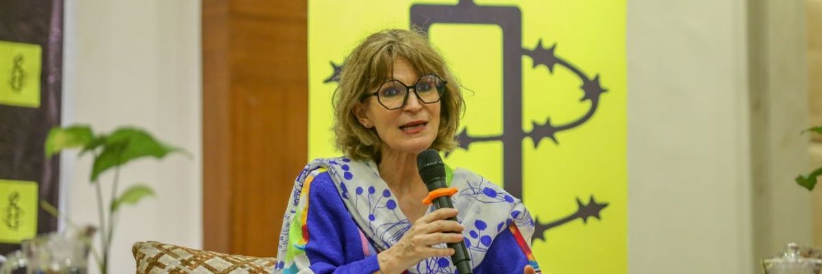 Amnesty International secretary general Agnès Callamard addresses a media interaction program organized in Kathmandu, Nepal, on May 24, 2024.