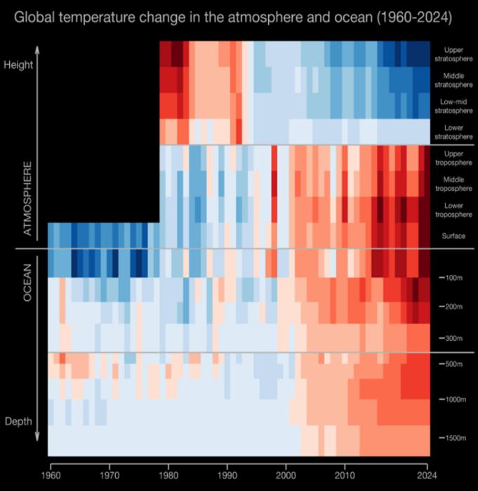 “Figure 2: Warming stripes for the surface and ocean depths (1960-2024), and for different layers of the atmosphere (1979-2024).” Hawkins et al. (2025), Bulletin of the American Meteorological Society. doi: 10.1175/BAMS-D-24-0212.1. Image license: CC BY 4.0