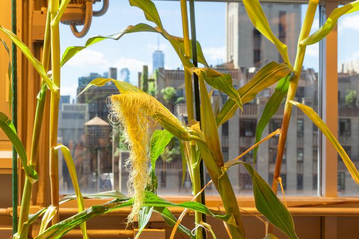 Corn growing in the Irene Rose Sohn Zegar Memorial Greenhouse on the top floor of NYU’s Center for Genomics and Systems Biology.