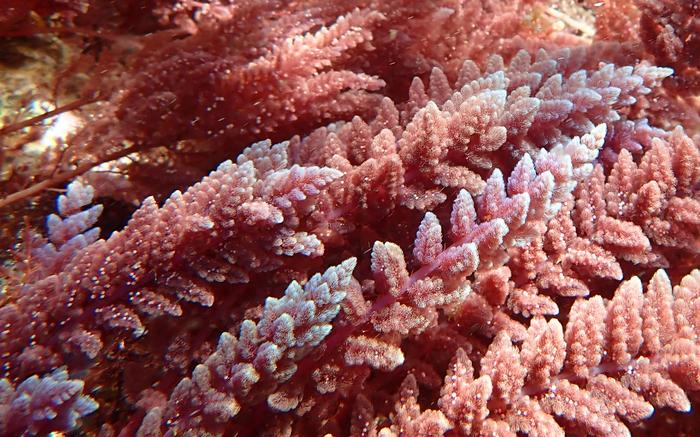 In the European Journal of Phycology, the team now publishes its findings. They discovered that a certain kind of cells of the red algae, called the “gland cells,” contain bodies of tightly packed microspheres of a light-reflecting material. In the growth tips of the red alga Asparagopsis taxiformis, these microspheres are all of the same size, which allows light of a single, blue color to be reflected. As the gland cells mature, the microspheres lose their uniform size, which causes light of all colors to be reflected, resulting in a whitish hue. “The structural color of red and brown algae living in shallow water has been explained to protect the photosynthetic pigments or to optimize photosynthesis. However, little is known about the structural color seen in deep water species,” explains Kawai.