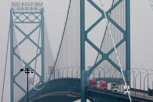 FILE - Trucks enter into the United States from Ontario, Canada across the Ambassador Bridge, Monday, Feb. 3, 2025, in Detroit.© AP Photo/Paul Sancya, File