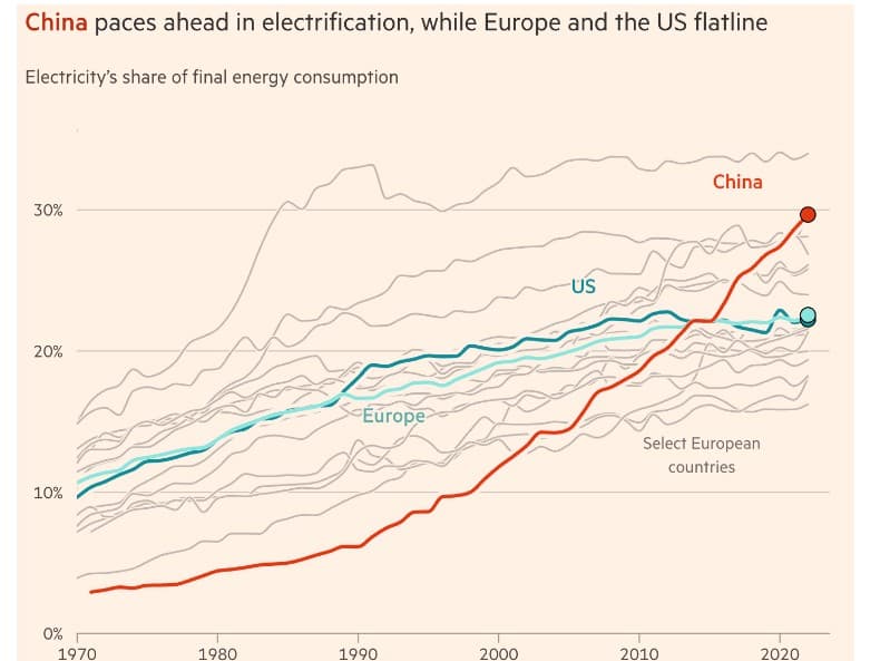 - China leads the world in electrification, with a 30% electrification rate—far ahead of the U.S. and EU at ~22%—dominating sectors like transport and industry.