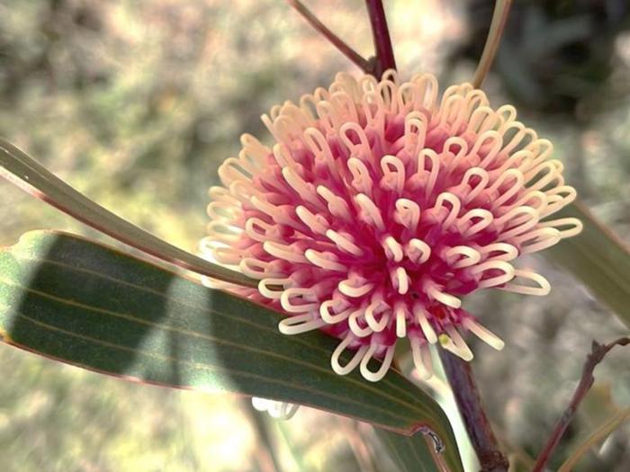 Hakea laurina, or pincushion hakea, is a shrub native to southwestern Australia, best known for its beautiful pincushion-shaped flowers.