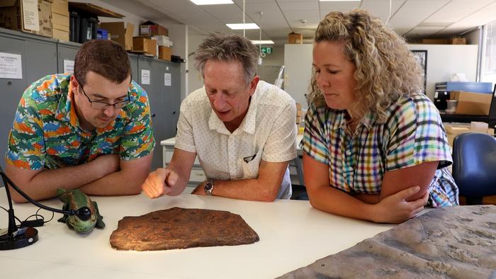 Dr Aaron Camens, Professor John Long and Dr Alice Clement with a replica of the fossil trackways at Flinders University's Palaeontology Lab.